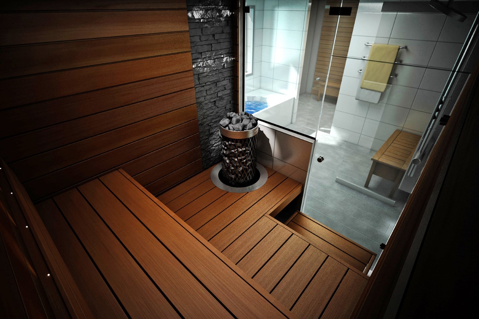 wave_laudemallisto_iki_kiuas_upotettuna_lauteeseen_lasiseina_saunaan_pyyhekuivain